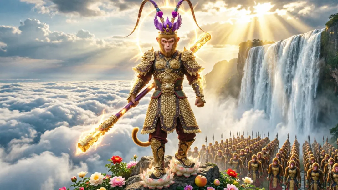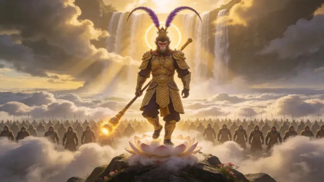 齐天大圣孙悟空,身披锁子黄金甲,头戴凤翅紫金冠,脚踏藕丝步云履,手持发光的如意金箍棒,站在花果山之巅。身后是漫天云海和壮丽瀑布飞流而下,金色阳光穿透云层在猴王周围形成神圣光晕。远景中成千上万的小猴列阵而立,画面气势磅礴,史诗级电影构图,戏剧性光影,中国神话风格,超精细铠甲纹理,体积雾效果,8K分辨率,大师级作品。