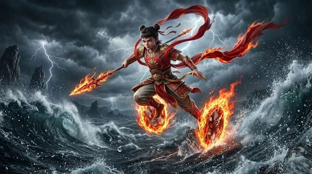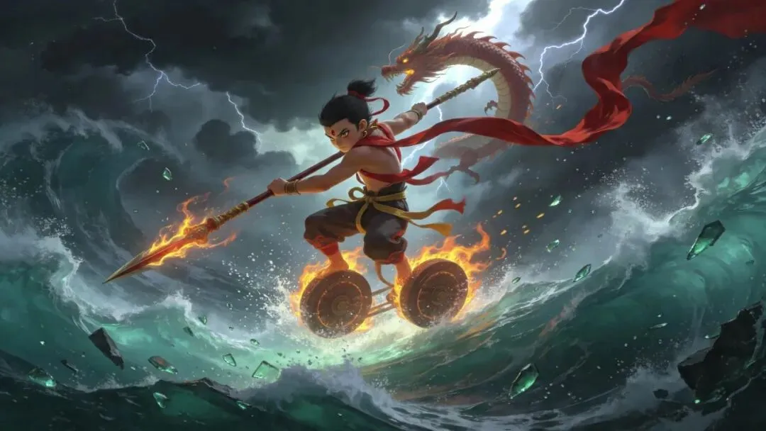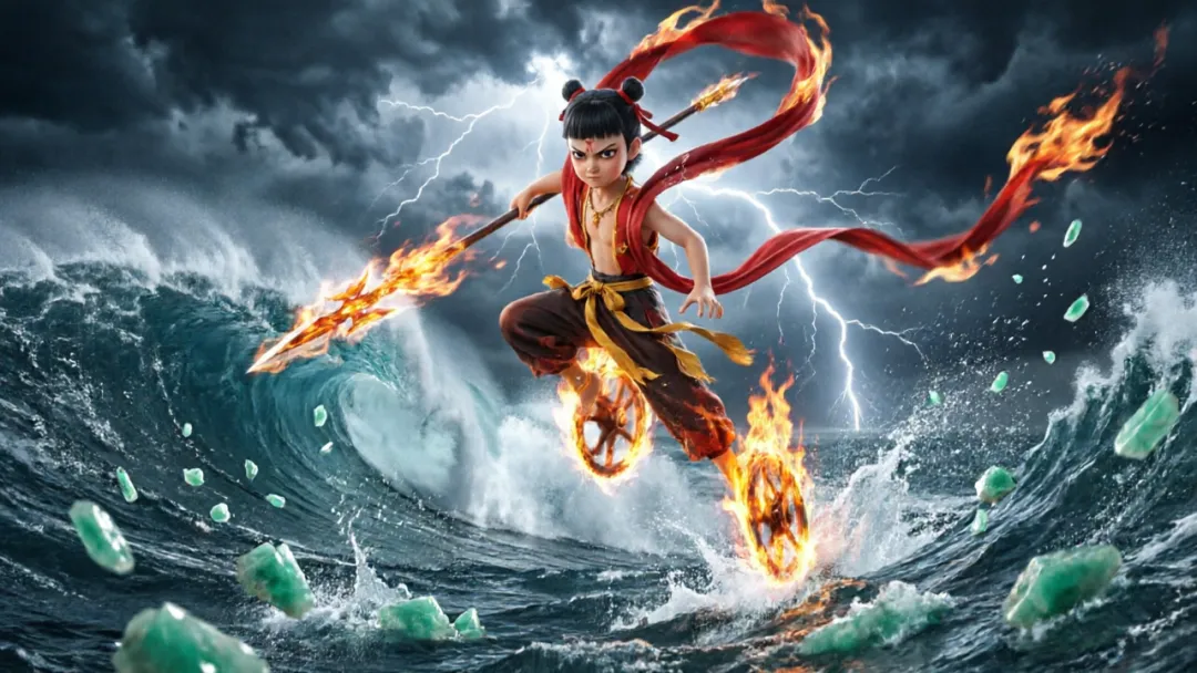 哪吒三太子,少年神将脚踏喷吐烈焰的风火轮,手持火尖枪,身缠如赤龙般飘舞的混天绫,在翻涌的东海波涛之上腾空而起。脚下巨浪滔天,海面被神力撕裂,水花飞溅如碎玉。乌云密布的天空,闪电照亮哪吒坚毅的少年面庞,桀骜不驯的英雄气概,动态动作姿态,中国神话风格,戏剧性明暗光影,超精细水花粒子效果,8K分辨率,电影级画面。