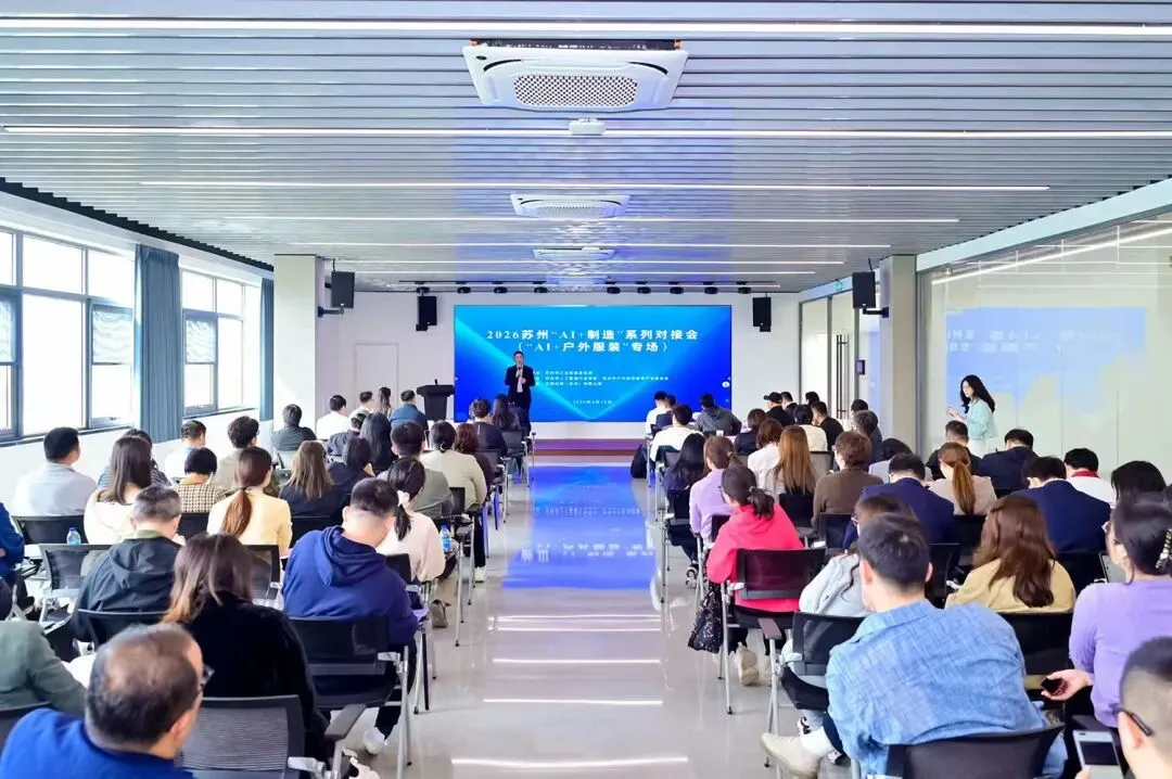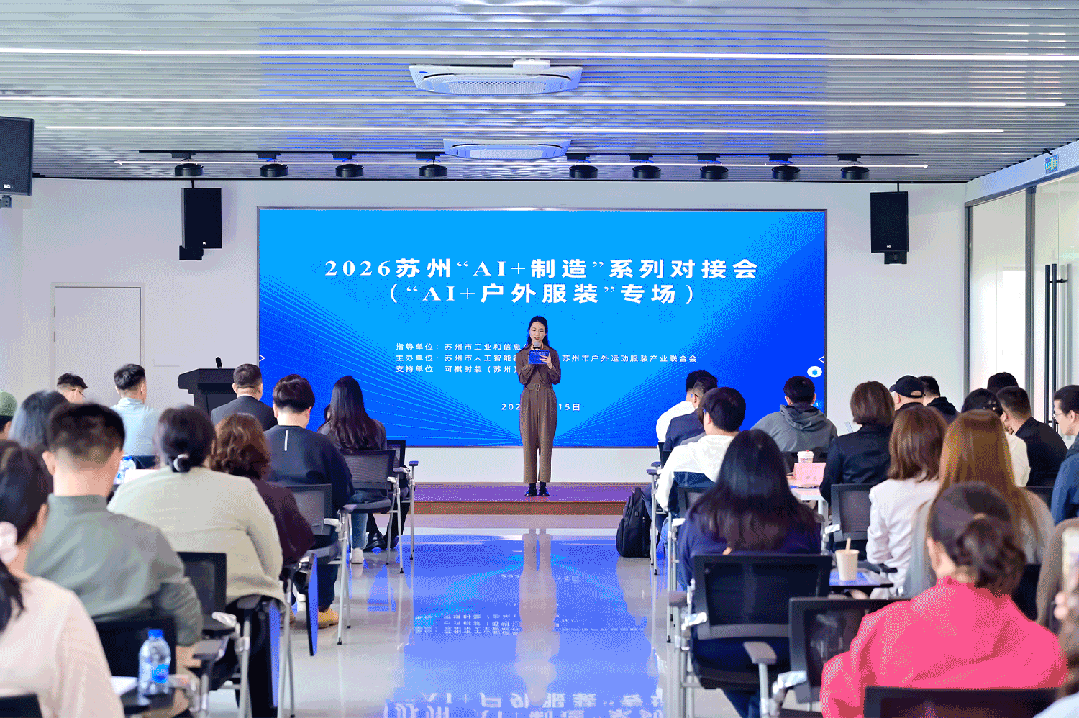 4月15日,2026苏州“AI+制造”系列对接会——“AI+户外服装”专场在可祺时装(苏州)有限公司成功举行。本次活动由苏州市工业和信息化局指导,苏州市人工智能行业协会、苏州市户外运动服装产业联合会联合主办,可祺时装(苏州)有限公司提供支持。