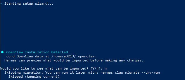 首先会识别如果安装了openclaw,可以把openclaw配置迁移过来,网上有人说这个功能又bug,我就选择n了。