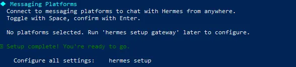接下来是消息平台设置,也可以现在不设置,后面通过hermes gateway setup再去设置