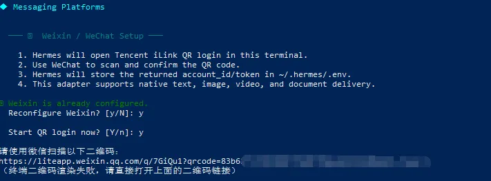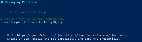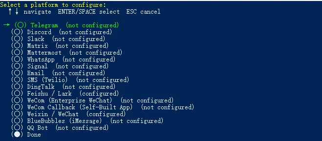 这里主要接入了微信、飞书。执行如下命令开始消息平台的接入配置