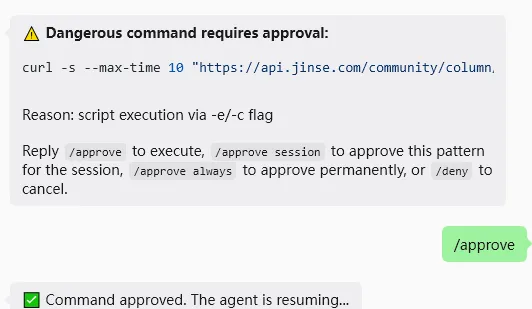 再一个和openclaw不一样的地方就是,调用工具的时候,都得批准,确实安全性更好,当然根据实际情况,可以选择当前会话批准、或者总是批准。