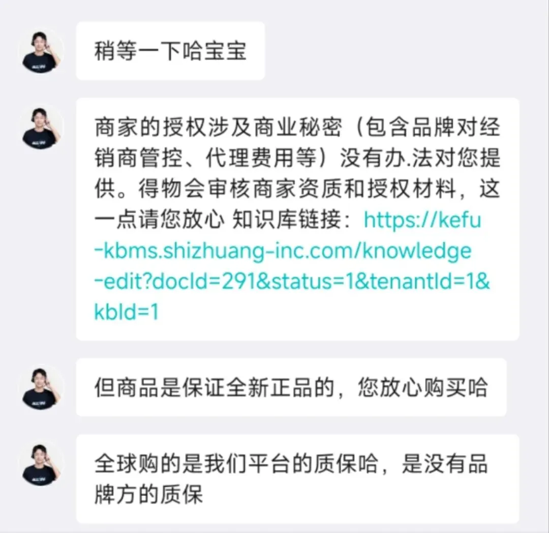 得物客服称商家的授权涉及商业秘密。图源得物App截图
