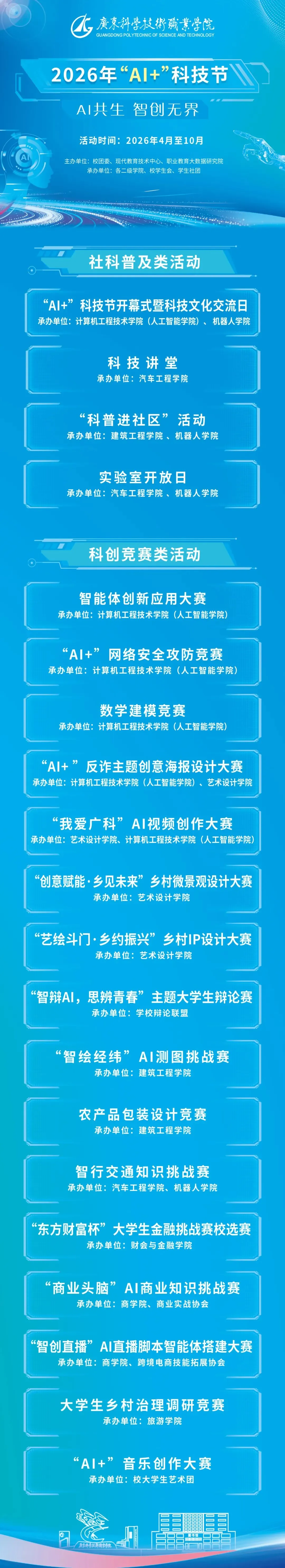 20项特色活动,“AI+”科技节,你打算pick哪一项?广东科学技术职业学院2026年第二届"AI+"科技节即将开启涵盖社科普及、科创竞赛两大类别20项特色活动带你领略AI技术的无限魅力激发创新思维探索智能科技提升实践能力拓宽知识视野培养探索精神展现科技风采活动主题AI共生,智创无界主办单位校团委现代教育技术中心职业教育大数据研究院活动时间2026年4月—10月活动预览后续各项活动详情将于本公众号推送敬请留意一起奔赴这场属于青春的科技盛宴!-谢谢积极向上的你看完本篇推送-校团委融媒体运营中心编辑:许安怡 巫雪梅初审:卓婉婷复审:钟耀庆终审:曾观红一起分享广科的点滴