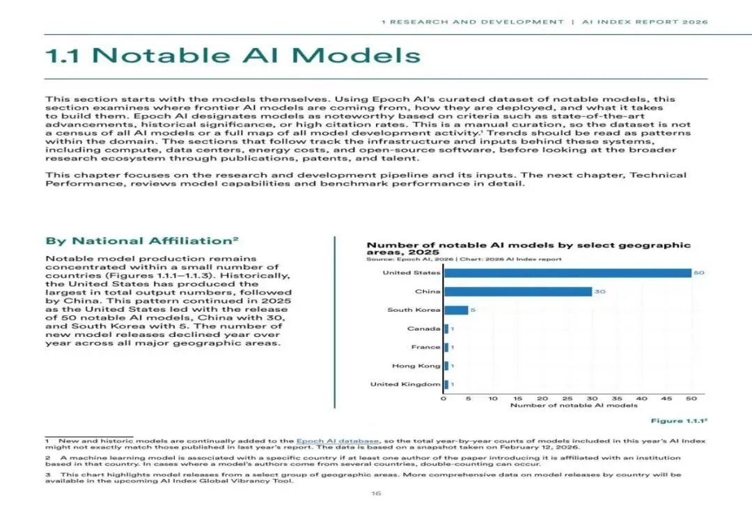 图1:2025年各主要地区值得关注的AI模型数量(来源:Epoch AI / 2026斯坦福AI指数报告)