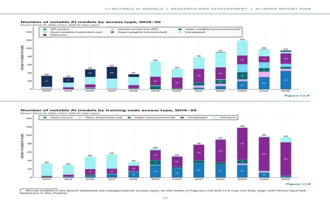 图2:2014-2025年值得关注的AI模型按开放程度分类(来源:Epoch AI / 2026斯坦福AI指数报告)