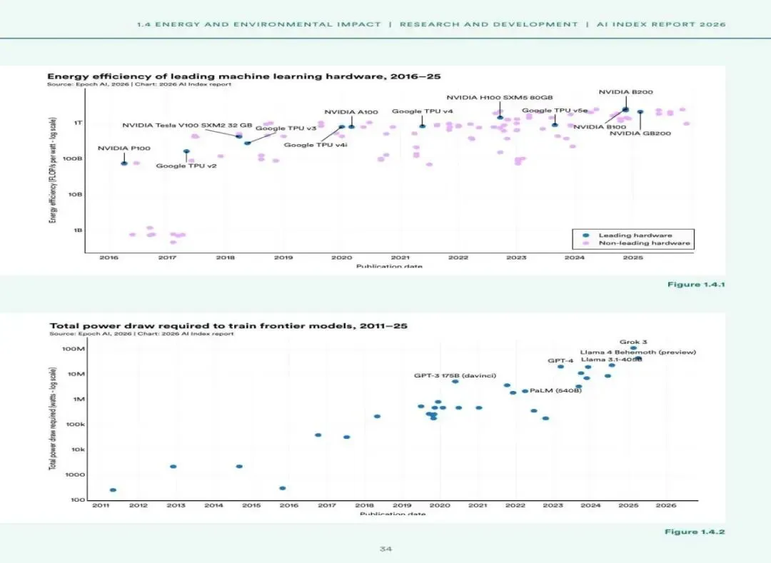 图3:领先机器学习硬件的能效演进(上)与训练前沿模型所需总功耗(下)(来源:Epoch AI / 2026斯坦福AI指数报告)