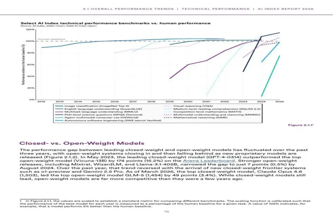 图5:多项AI技术性能基准对比人类表现(2012-2025)(来源:AI Index 2026)