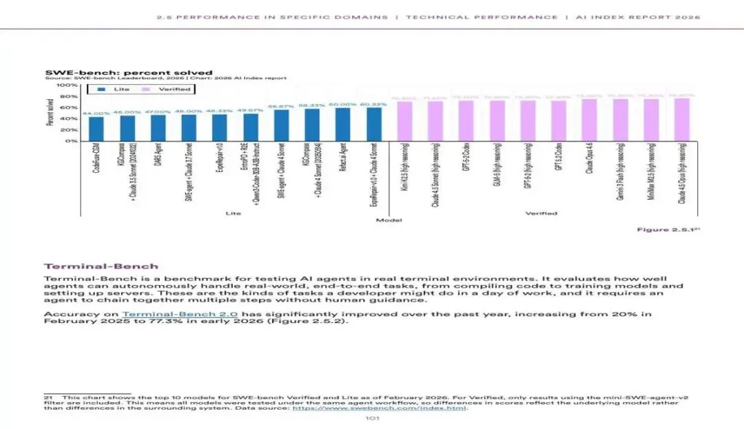 图6:SWE-bench代码生成基准——各模型解决率(来源:SWE-bench Leaderboard / AI Index 2026)