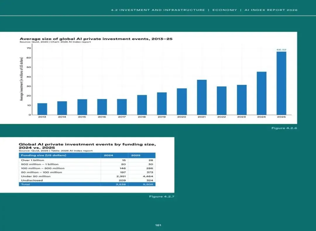 图8:全球AI私募投资事件平均规模(2013-2025)及大额融资分布(来源:Quid / AI Index 2026)