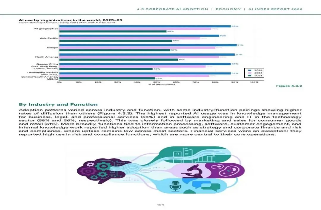 图9:全球企业AI使用率(按地区,2023-2025)(来源:McKinsey / AI Index 2026)
