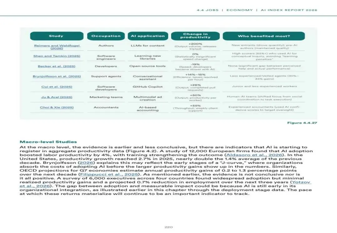 图10:AI对各职业生产力影响的研究汇总(来源:多项学术研究 / AI Index 2026)