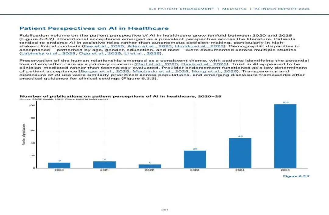 图11:患者对AI在医疗中应用的认知研究文献增长(2020-2025)(来源:RAISE Health / AI Index 2026)