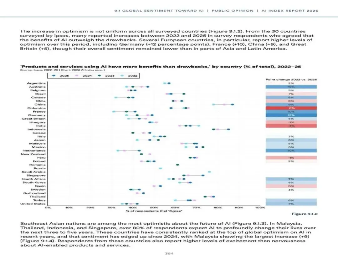 东南亚是全球AI乐观情绪最高的地区:在马来西亚、泰国、印度尼西亚和新加坡,超过80%的受访者预计AI将在未来3至5年内深刻改变他们的生活。印度则出现了所有受调查国家中最大的"焦虑感"跃升(+14个百分点)。
