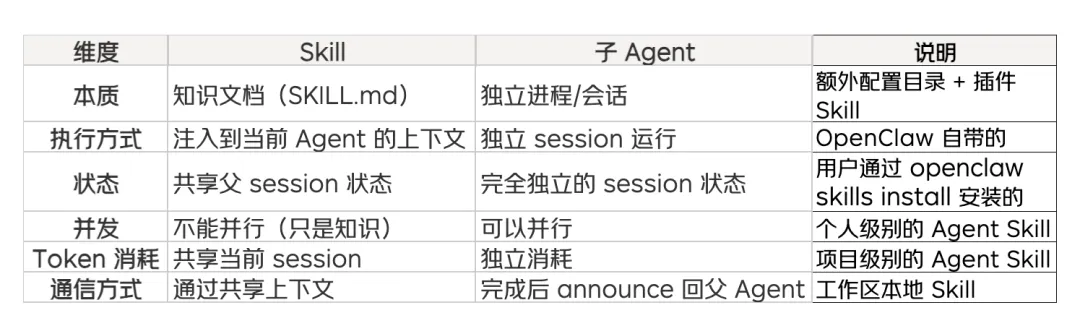 Skill 和子 Agent 在 OpenClaw 架构中扮演不同但互补的角色: