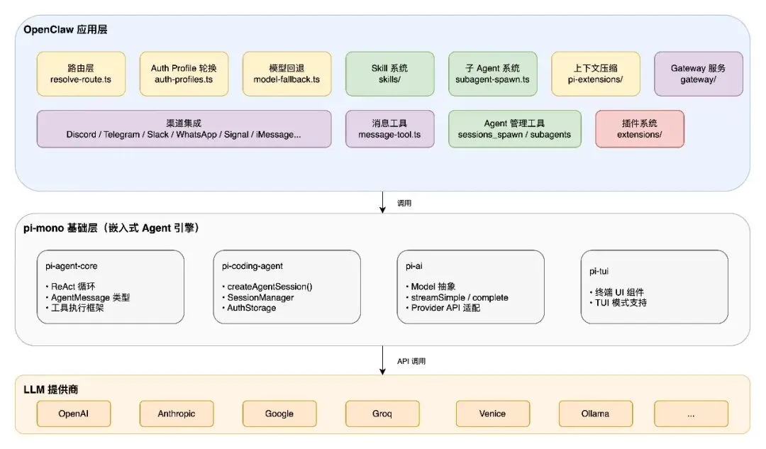 1. 基础设施层:基于 pi-mono(嵌入式 Agent 引擎),提供 ReAct 循环、LLM 调用、工具执行等底层能力