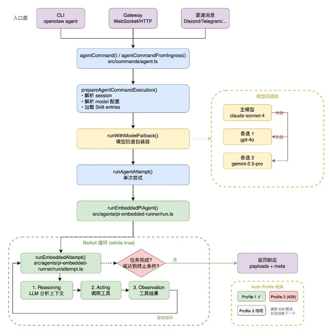 从用户请求进入(CLI/Gateway/HTTP)、经过路由匹配、模型解析、ReAct 循环执行、工具调用、到最终响应返回的完整调用链。包含 runWithModelFallback`的回退逻辑和 runEmbeddedAttempt的内部步骤。