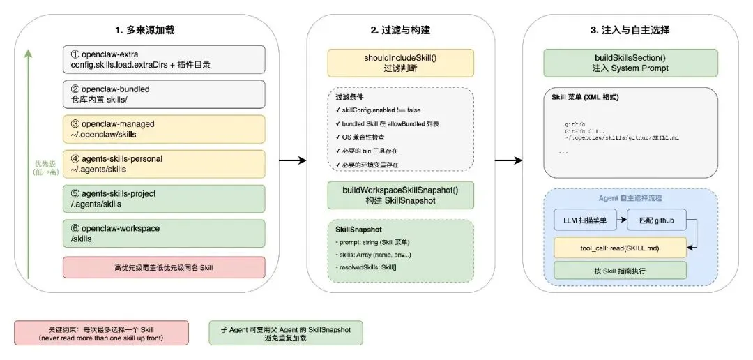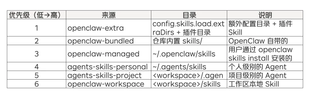 Skill 的加载由 src/agents/skills/workspace.ts中的 loadSkillEntries()负责,它从6 个来源按优先级合并: