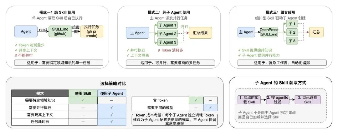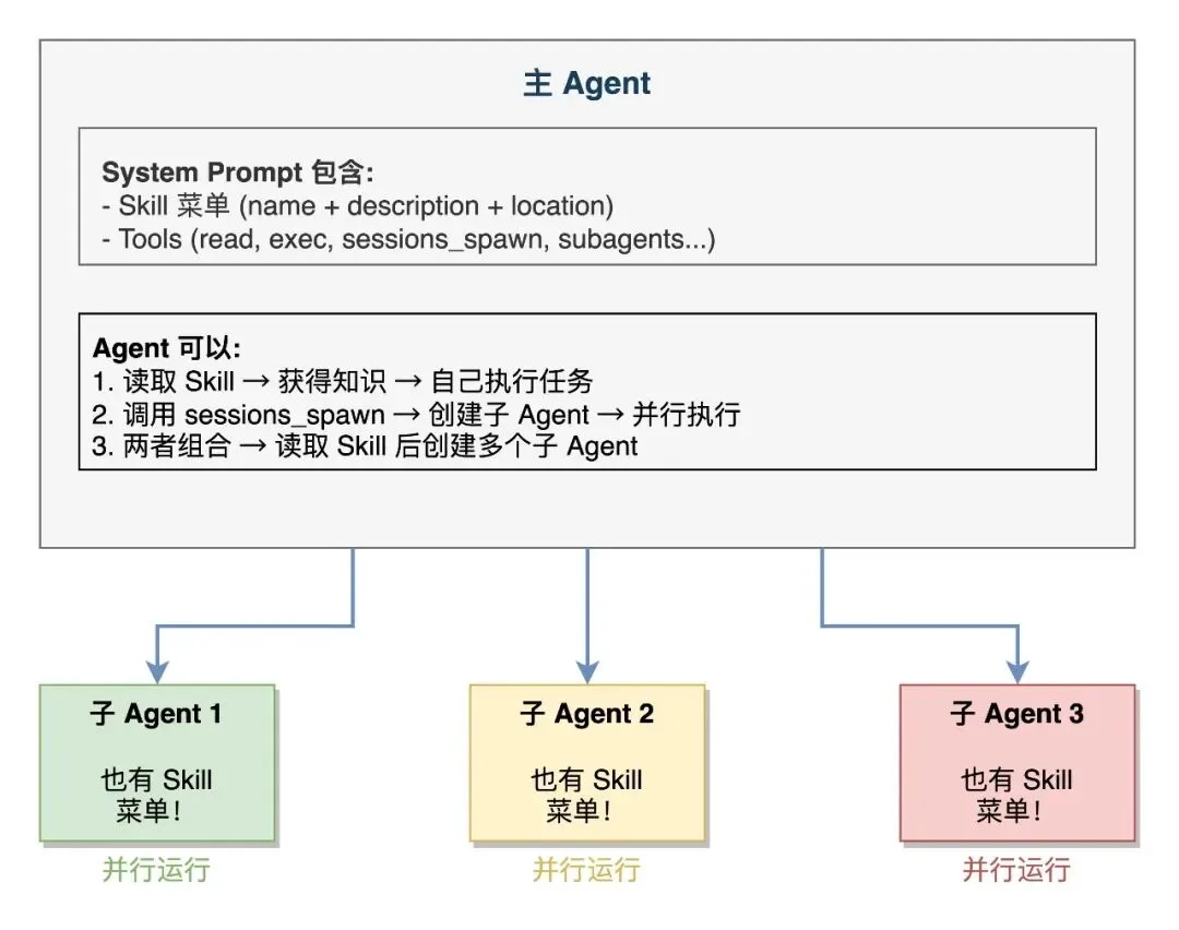 两者不是替代关系,而是互补关系。一个 Agent 可以在读取 Skill 获得知识后,再创建多个子 Agent 并行执行任务;子 Agent 自身也可以使用 Skill。