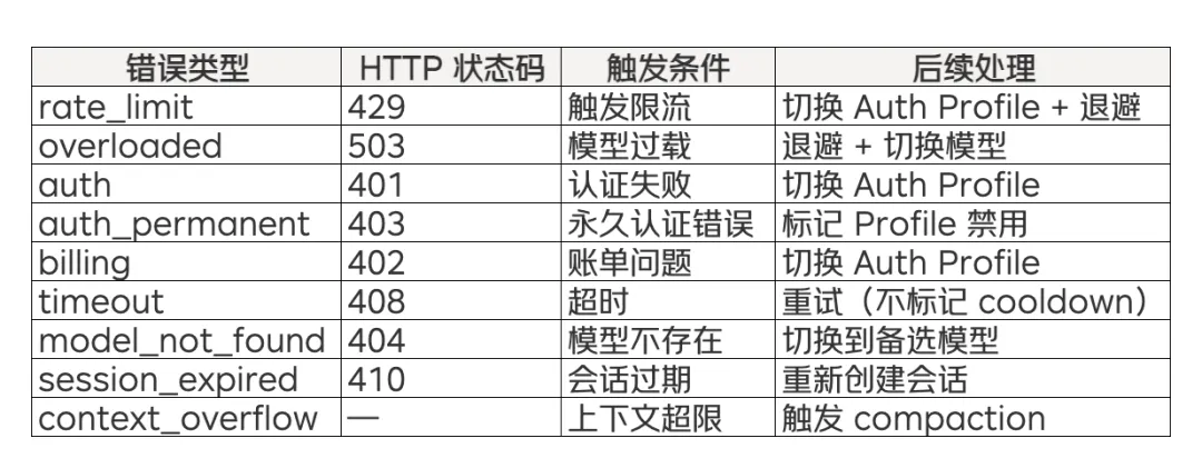 - 处理 LLM 提供商的各种故障(限流、过载、认证失效)并自动恢复