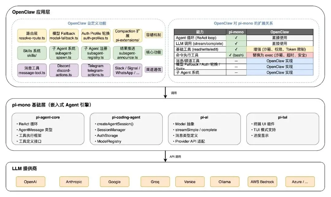 OpenClaw 并非从零构建 Agent 引擎,而是基于 pi-mono这个嵌入式 Agent 基础包进行扩展。理解两者的边界有助于把握系统的整体架构。