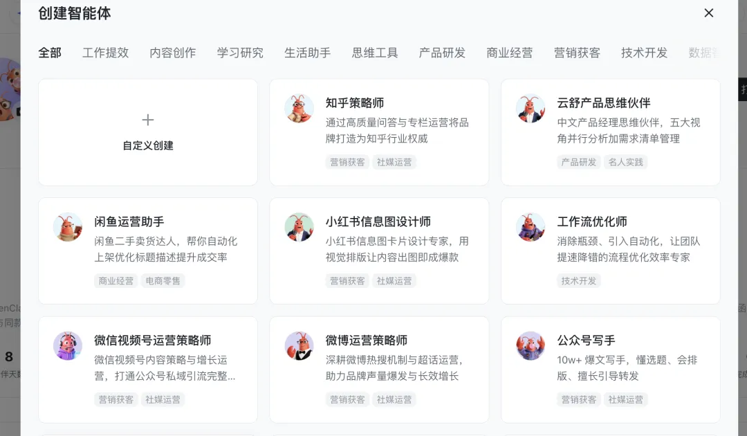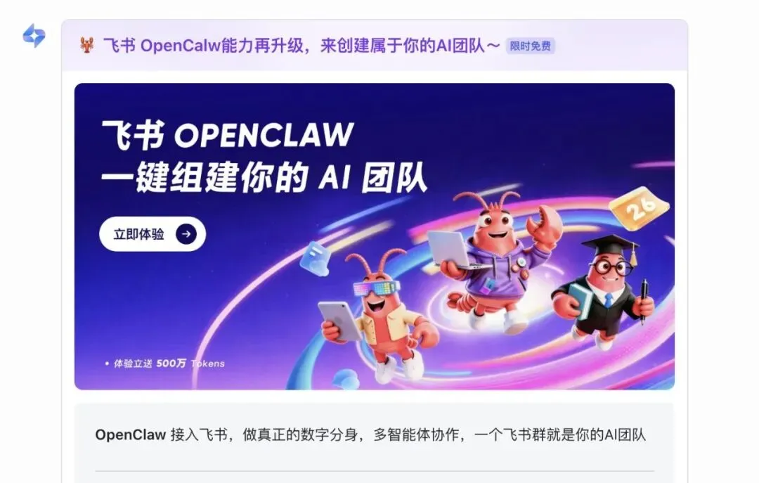 举例:我们来搭一个新媒体的数字团队,找到公众号助手,然后点击创建,它就会自动的一键部署,部署完成之后,我们还可以添加视频号、运营策略师以及营销模板等等智能体,然后回到飞书,就可以在一个群聊里面分工工作啦!找选题,写文章,设计海报一站式搞定!