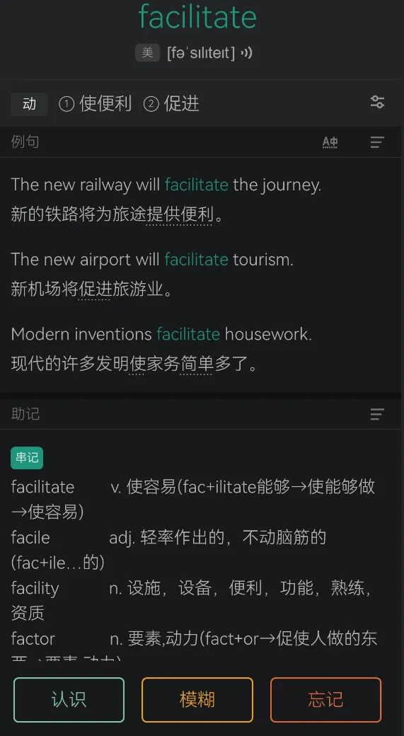 如你所见,到今天我已经连续背单词412天,也就是一年两个月左右,但初心并没有实现,女儿对我每天背单词的行为视而不见。于是,背单词这事对我而言成了无用之事,为什么还能一直坚持到现在呢?说来也巧,就在我觉得行为无用准备放弃的时候,看到了一篇文章,一个厉害的心理学家写如何延缓大脑的退化。文章主旨简单的说就是要“用”,包括学习新东西比如背单词,锻炼手眼协调性比如玩电脑游戏。四十大几的我眼前一亮,那就把背单词坚持下去好了,正好延缓大脑的必然衰老。这个软件叫墨墨背单词,主要是通过对艾宾浩斯遗忘曲线的应用来达到高效记单词的目的,400多天过后,我确定这个方法是极其有效的。每个单词就是上图那样的页面,方便理解也方便发散记忆别的单词,通过对认识、模糊、忘记的标记,结合遗忘曲线确定每个单词的重复出现频率。所谓对艾宾浩斯遗忘曲线的应用,就是对抗人类与生俱来的遗忘的天性。按照艾宾浩斯的研究,人类识记最初阶段遗忘速度最快,随后逐渐缓慢,最终稳定在一定水平,几乎不再遗忘 。根据他的研究,人20 分钟后记忆量约为 58.2%,1 小时后降至 44.2%。1 天后仅剩 33.7%,6 天后稳定在 25.4% 左右 。若无复习,一周后记忆率可能低至 13%。单词软件通过让单词在临近遗忘的时间点反复出现,使之及时的被复习,达到长久记住单词的目的。现在来回答标题中的问题,做背单词412天这个无用之事,我收获了什么?其一,我实现了延缓大脑衰老的目的。此前一度有记忆力衰退迹象,对做过不久的事也容易遗忘,现在迹象已消除。其二,对一个没有从英语学习中收获过信心的人来说,这400多天实打实长期记住了1300多个雅思单词,可以说是第一次收获了学英语的信心。这个信心还体现在敢于和外国人交流,有次有个新加坡人问路,单词量让我们的交流变得愉悦,当我句子里带出了comprehensive这个单词的时候,他的眼睛明显亮了。其三,激发了我对英语的兴趣,看电影的时候喜欢看英语字幕听英文对白了,喜欢和豆包的英语ai智能体对话了。其四,长期坚持本身就是对人的韧性和自控力的锻炼,当坚持的是看似无用之事的时候,这种锻炼就更纯粹。而韧性和自控力是人的元能力,可以被用于人的几乎所有人生场景中。以上就是我对412天背单词的总结,毫无疑问我会继续坚持做下去。如果你也想开始做些持久坚持的事,我还有一个经验可以分享:习惯最怕中断,比如背单词,如果背一周停一周或者不规律的间断几次,大概一个月左右你就会自然而然的放弃了。为避免中断,可在形成长久习惯以前强制每天打卡,可以设置手机闹钟提醒,我一度设置了3道闹钟,最晚的一个在晚上11点半,已确保做到打卡。最后我还想说,这种长期坚持的微习惯并不很费时间,412天看似很长,但软件统计一共只用了83个小时而已。83个小时记住1300多个比较难的单词,这个效率还是挺高的。更印证了那句话的正确性:less is more,slow is fast!就写到这吧,请关注老合(公众号:自信人生在华年),咱一起完善老己。#412 天背单词打卡 #长期主义 #微习惯养成 #艾宾浩斯遗忘曲线 #中年自我成长 #墨墨背单词 #慢成长 #自律修行 #大脑抗衰 #无用之事自有力量