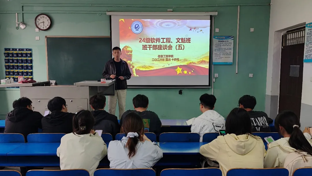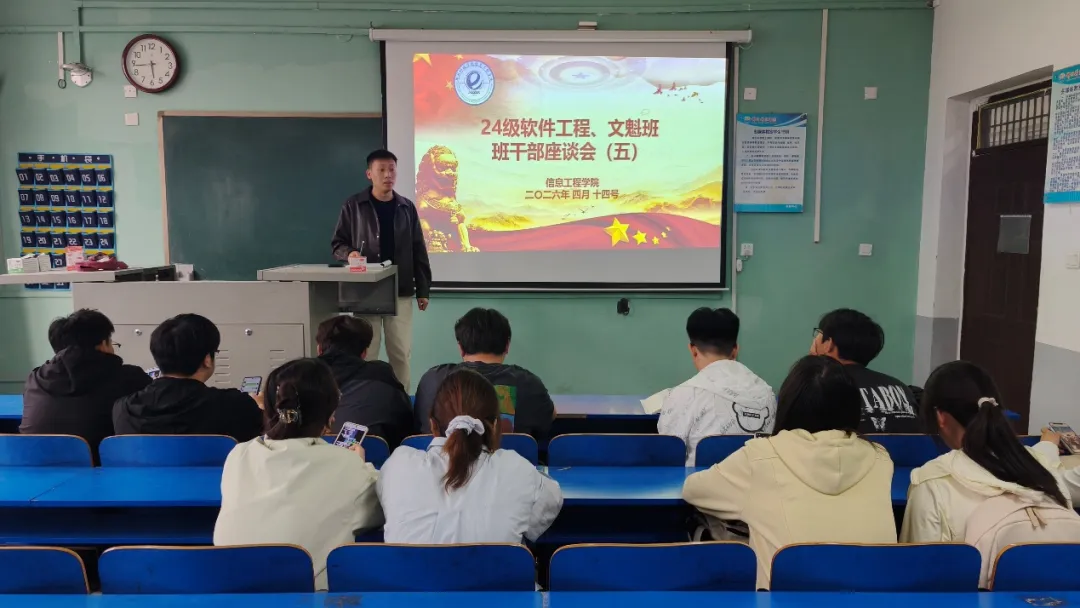 为进一步强化学风建设实效,提升班级管理精细化水平,4月14日晚上18:00,信息工程学院24级软件工程、文魁班班干部座谈会(五)如期召开。会议由辅导员牛渤超主持,各班班长、团支书参加会议,针对近期班级问题进行汇报,梳理工作短板,并安排后续学风建设与日常管理任务。
