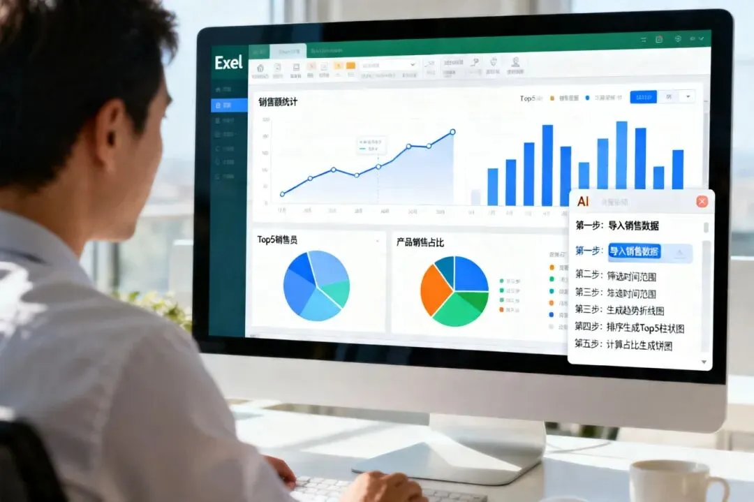 按照AI的建议操作,就能在短时间内完成全部分析,并生成专业图表。比如月度销售趋势分析,AI会建议插入透视表,设置行=月份,值=金额求和,推荐使用折线图来显示趋势;对于Top 5销售员分析,会建议用透视表,行=销售员,值=金额求和,排序降序取前5,推荐柱状图直观对比;产品类别占比分析则建议用透视表,行=产品类别,值=金额求和并显示百分比,推荐饼图或环形图。这种AI辅助的数据分析流程大大提高了工作效率,让数据分析变得更加轻松。