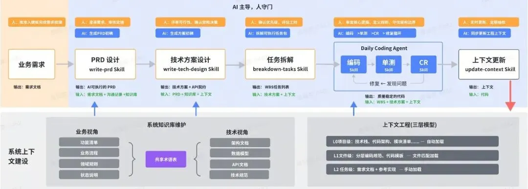 这张图将交付链路拆为六个阶段。如果只看动作名称——需求、PRD、方案、拆解、编码、更新——很容易将其理解为一条普通流程线。但从架构视角看,这六个阶段的核心逻辑不是线性流程编排,而是上下文逐级收敛、阶段持续校验、结果最终回写。其中前两个阶段本质上是产研协同对业务意图、边界条件和验收口径的显性化,后四个阶段则由研发侧将这些约束转化为可执行的工程资产和交付结果。