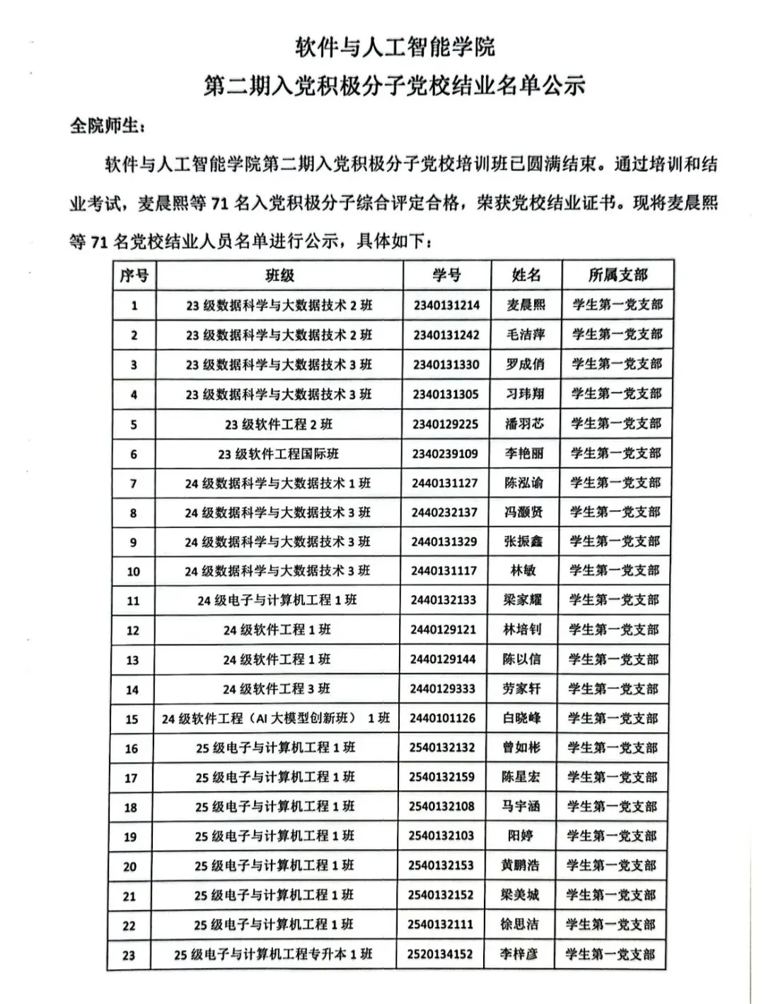 【公示】软件与人工智能学院第二期入党积极分子党校结业名单公示