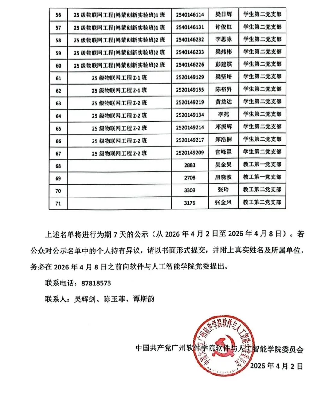 【公示】关于软件与人工智能学院2026年上半年拟推荐参加校发展对象培训班名单的公示
