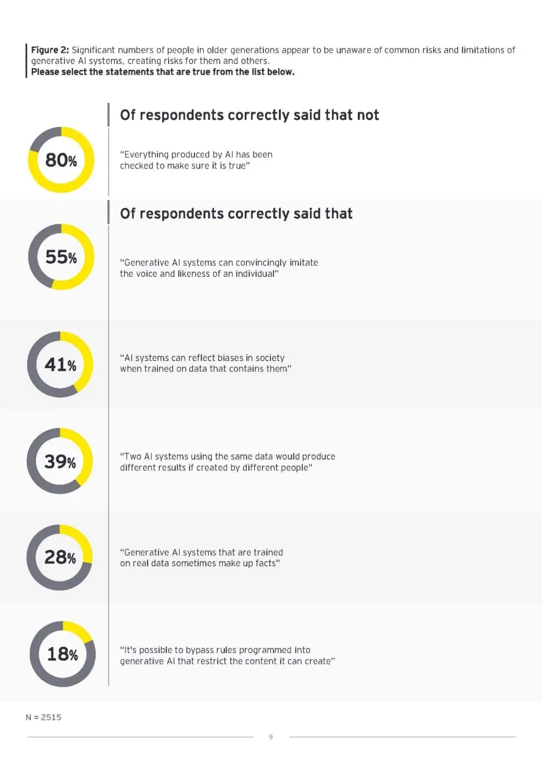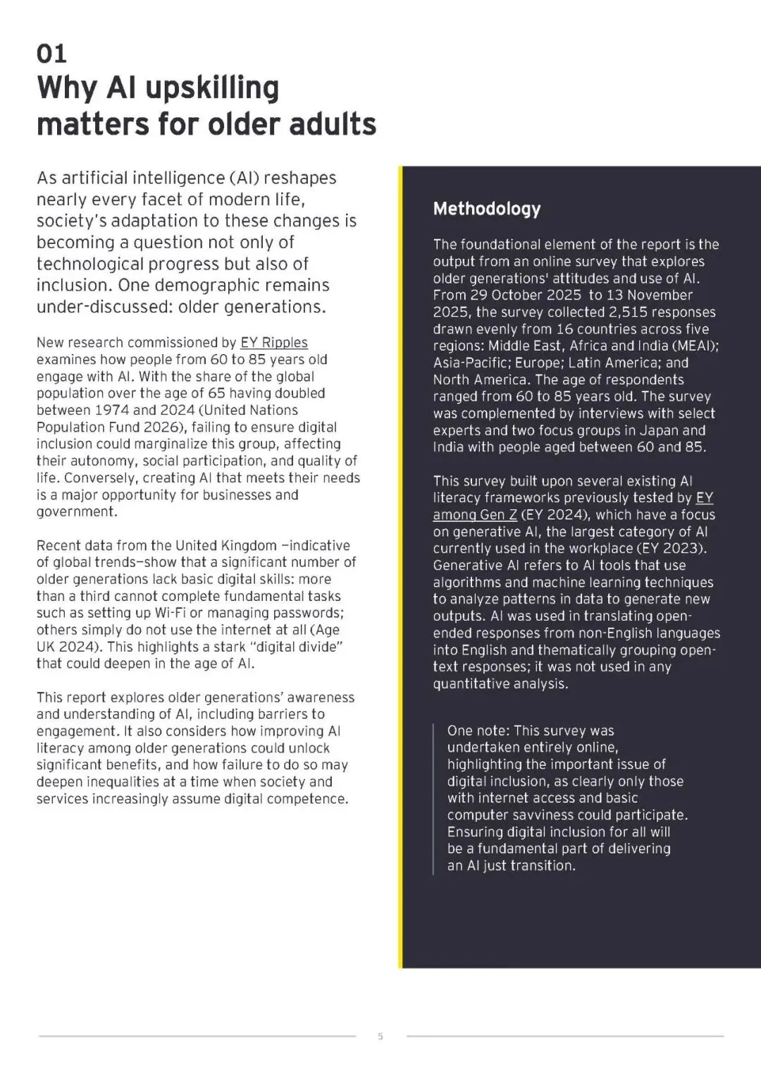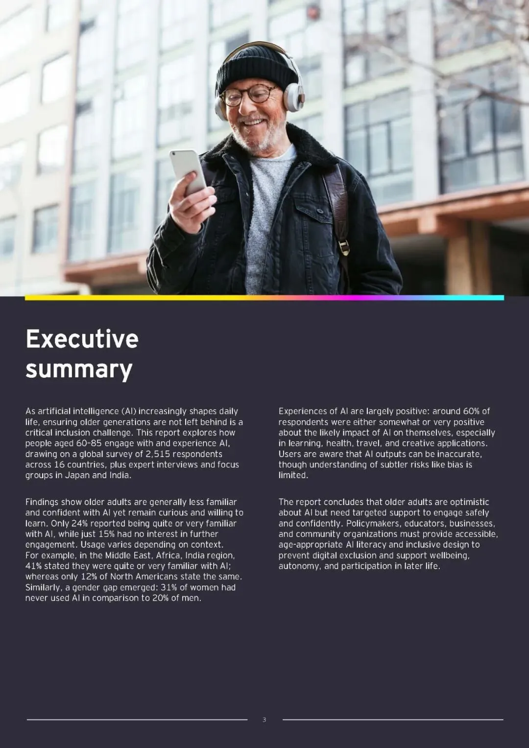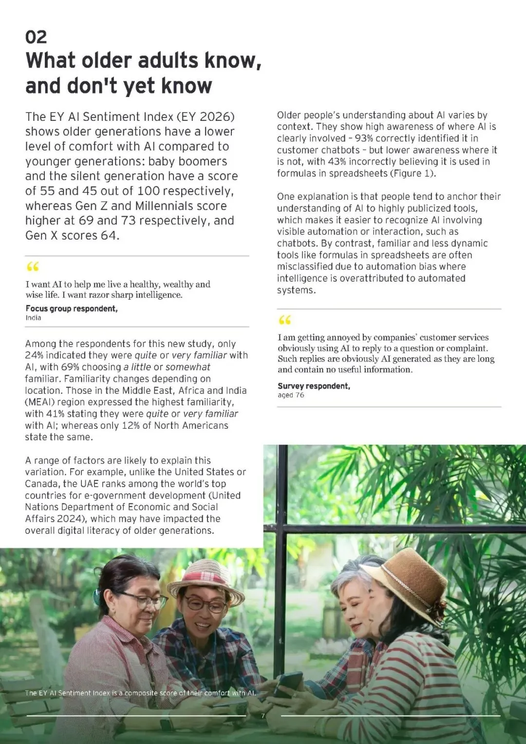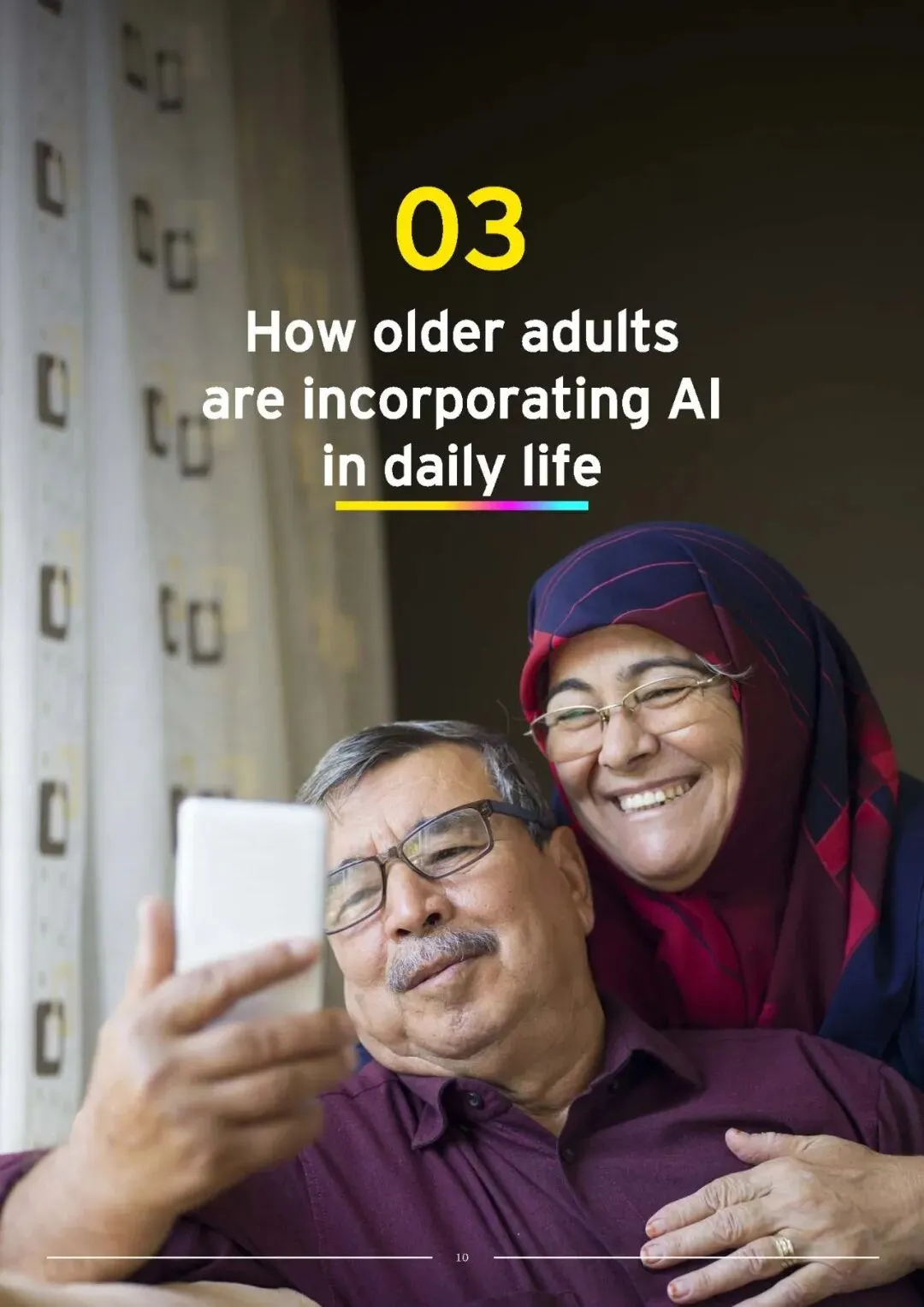 随着AI普及,确保老年群体不被边缘化成为关键挑战。全球调查显示,60-85岁人群对AI熟悉度较低,仅24%表示相当或非常熟悉,且存在地域和性别差异。老年群体对AI态度积极,约60%看好其对学习、健康等领域的正面影响,但对数据隐私等风险存顾虑。使用上,40%从未或仅偶尔使用AI,就业状态与使用频率正相关。