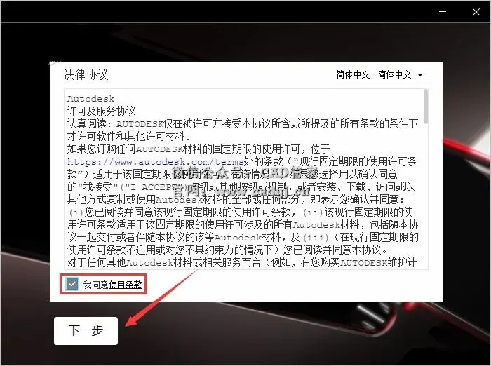 5.勾选【我同意使用条款】,然后点击【下一步】。