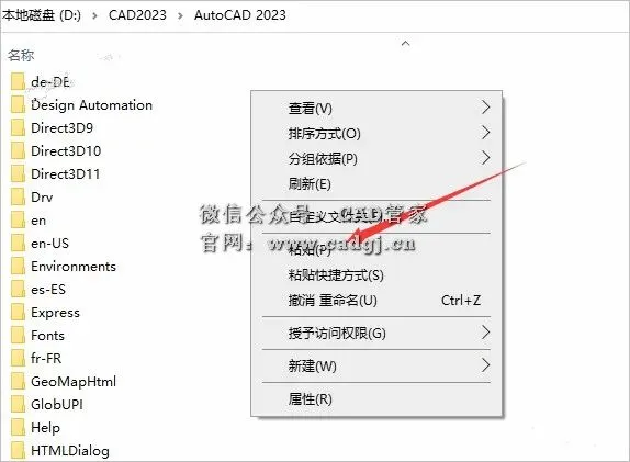 13.在打开的文件夹空白处,鼠标右击【粘贴】刚才复制的acad文件。