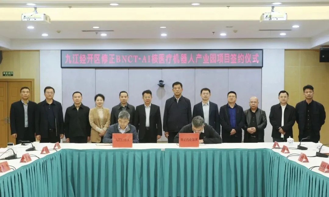 修正BNCT-AI核医疗机器人产业园项目签约落户九江经开区修正BNCT-AI核医疗机器人产业园项目签约落户九江经开区 4月15日,九江经开区举行修正BNCT-AI核医疗机器人产业园项目签约活动,标志着该项目正式落户经开区。该项目是九江经开区大力发展新质生产力,瞄准产业新赛道,助力打造区域制造业中心又一新成果。市政府副市长、九江经开区党工委书记陈水连,九江经开区党工委副书记、管委会主任戴炜,修正药业集团董事长修涞贵,修正药业集团总裁、浙江硼中医疗科技董事长修远出席签约仪式。市政府副秘书长周金辉、九江市商务局局长史岚、九江市自然资源局局长邹晨曦等市直有关部门负责人应邀出席活动。九江经开区党工委委员、管委会副主任刘名寿以及区有关部门负责人共同见证项目签约。 陈水连对修正药业集团一行表示热烈欢迎,对项目成功签约表示热烈祝贺。他说,当下九江正加快发展以核医疗为方向的未来健康产业,致力于打造服务全国的“中部核谷”。市、区两级将迅速组建工作团队,主动对接企业需求,全力协调要素保障,高质高效解决项目建设中的各类问题,不遗余力推动修正BNCT-AI核医疗机器人产业园项目早开工、早投产、早达效,服务企业在九江落地生根、发展壮大。 据悉,修正药业集团是集科研、生产、营销于一体的大型现代化民营企业,产品涵盖中成药、化学制药、生物制药等领域,旗下拥有3项国家驰名商标,连续多年入选中国民营企业500强,位列中国医药工业百强、中成药工业前列,并入选世界品牌500强。2026年2月,位列《2025胡润中国500强》第472位。在九江经开区投资建设的修正BNCT-AI核医疗机器人产业园项目,将建设年产10~15台超小型BNCT硼中子核医疗设备、10万台AI医疗机器人生产线,区域总部办公和研发大楼以及相关高性能医疗设备的智能制造基地等,着力打造以核医疗设备生产为主导的修正产业园。项目达产达标后,预计可实现年产值50亿元。(蔡文含/文 蔡钦/摄)扫一扫关注我们,更多资讯早知道!