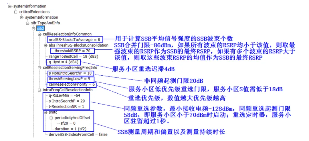 SIB2(系统信息块类型2)是5G NR网络中负责同频、异频及异系统间小区重选的核心系统信息块,主要为UE(用户设备)提供网络内和跨系统移动时的小区选择与重选所需的关键参数,鼎利软件层三信令详细解析如下: