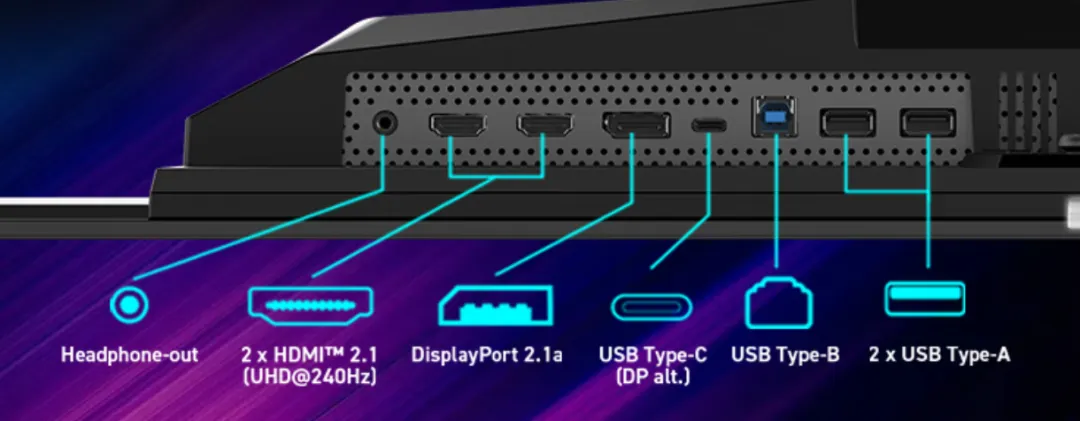采用双HDMI 2.1(非满血),DP 1.4接口满血输出2K@200Hz ,支持Adaptive-Sync兼容NVIDIA/AMD显卡。