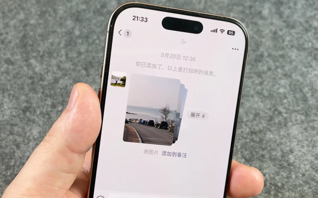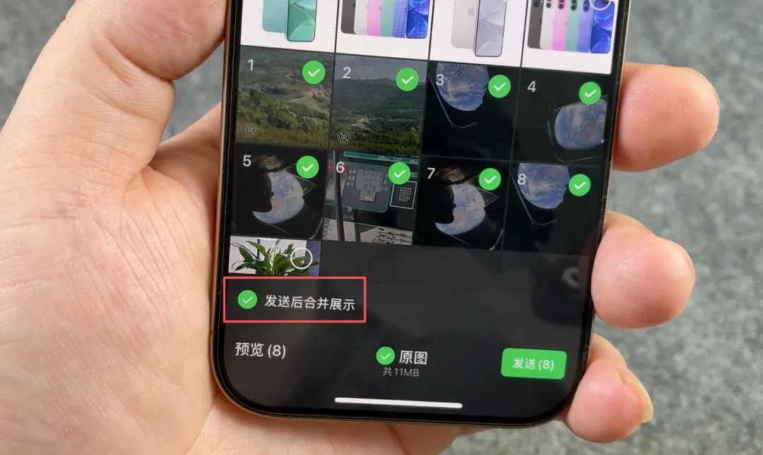 现在当我们向好友发送超过3张图片时,左下角就会蹦出一个「发送后合并展示」的选项,勾选该选项后再点击发送,你就会看到一个全新的图片展示方式。