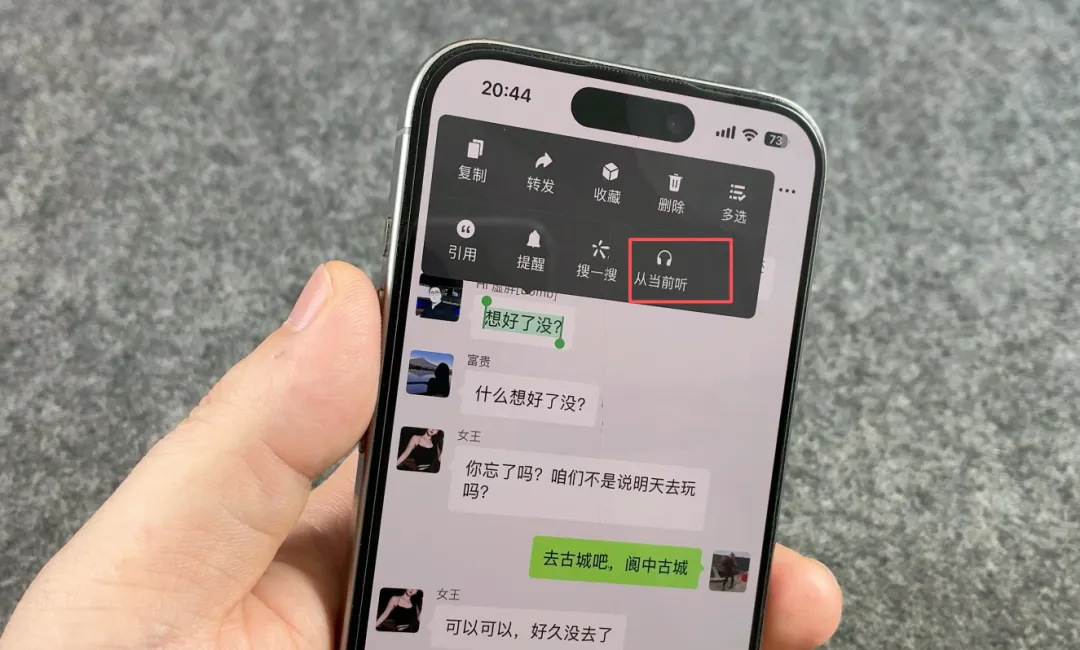 如果你在忙又想知道大家在聊什么,很简单,长按某一条消息后,点击「从当前听」,即可自动实现逐条朗读。