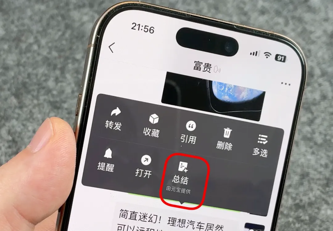 当我们长按聊天中的文件或转发的文章时,会在这里看到一个名为「总结」的新按钮,不过没有元宝的话,你还用不了它。