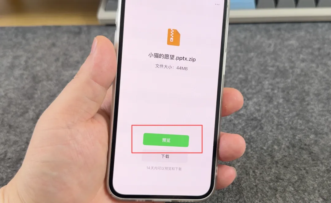 现在我们在收到新的压缩文件时,点击该文件后,你会看到一个新增的「预览」按钮,点击预览,即可直接查看该压缩文件,无需下载、也无需解压缩。