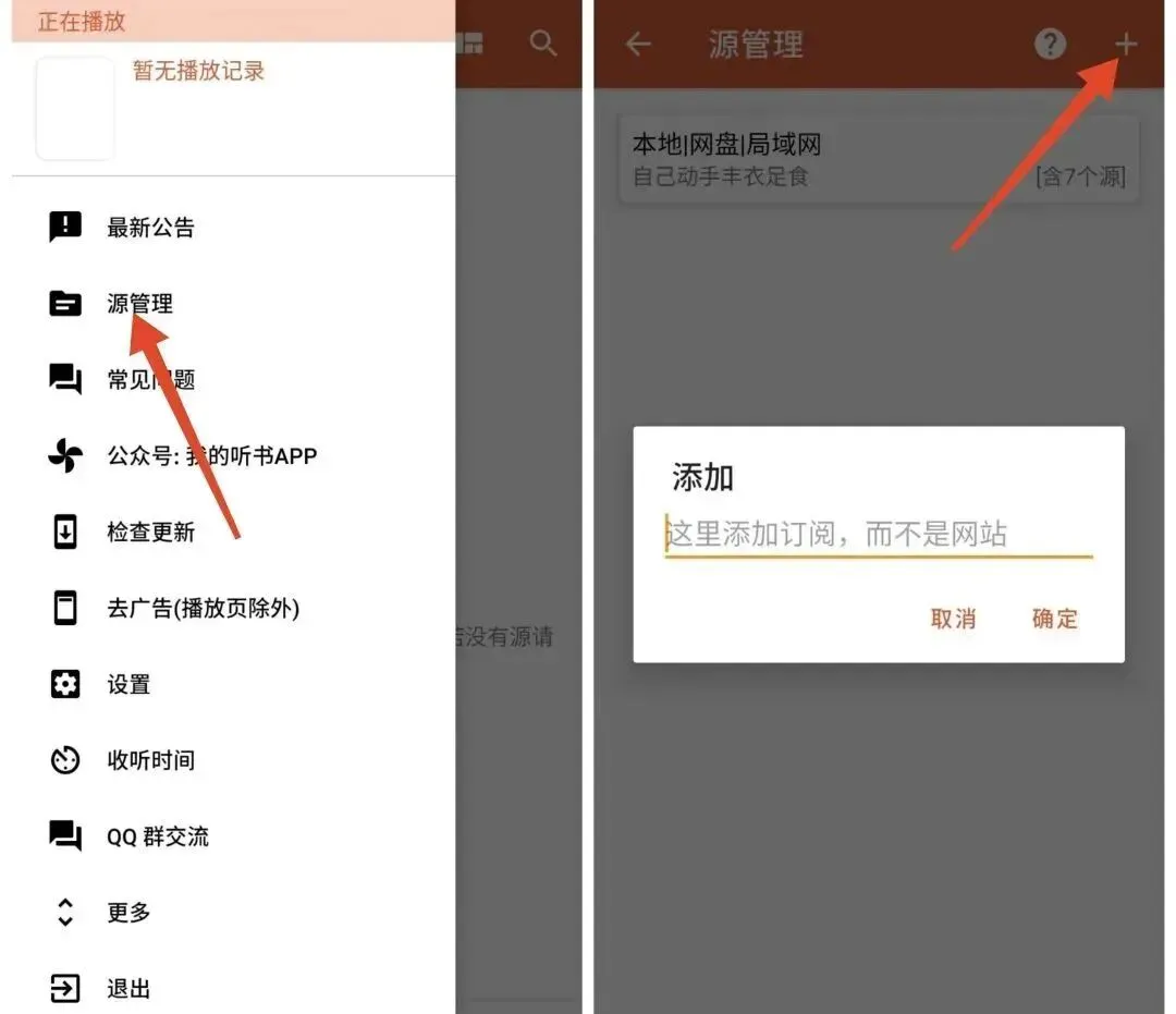 导入听书源教程:进入APP首页→点击左上角的“三”按钮打开侧边栏,进入“源管理”界面,点击右上角的"+"即可添加听书源