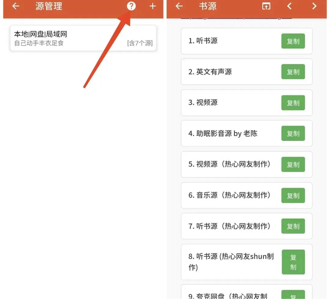 获取听书源:在"源管理"右上方的"?"里面,如果无法进入,也可以在订阅界面输入数字1-9,其中1、7、8是听书源合集