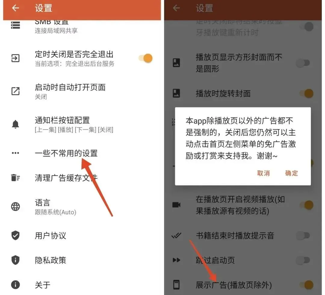 我的听书App里的广告可以直接关闭!不需要看激励视频来换取免广告时间,只要在【设置】-【不常用设置】里关闭"展示广告"选项就行。