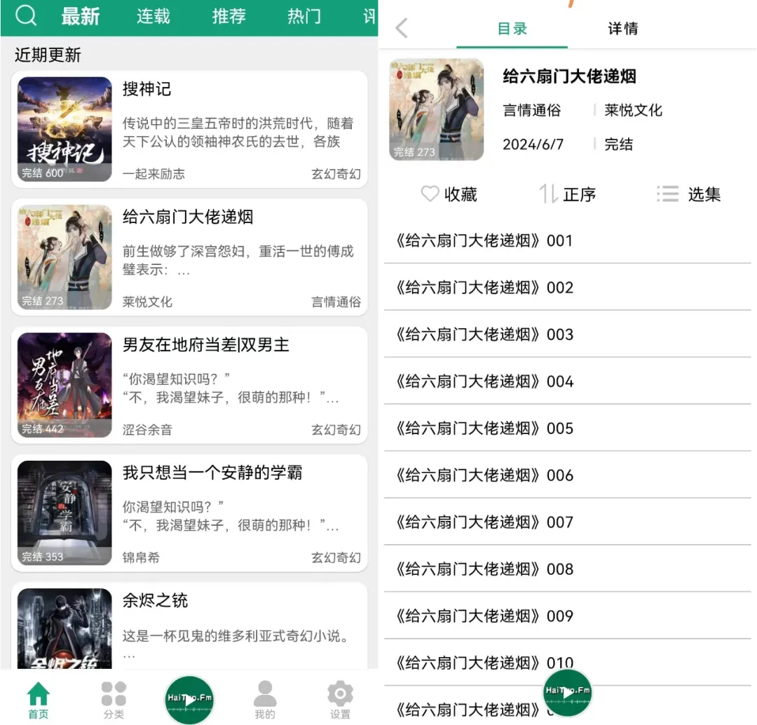 一款超棒的免费听书软件,海云听书的升级版,资源非常丰富,界面设计简洁清爽,功能结构清晰有序。首页上方有着推荐、更新、新书、男频、女频、广播剧等板块内容,分类明确,方便大家快速找到心仪的有声读物