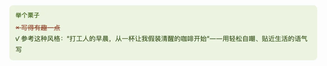 你喜欢什么风格、不要什么套路,直接丢例子给 AI 看,比你说一百个形容词都管用。参考可以是一篇你喜欢的文章、你欣赏的博主、甚至你之前写过的内容。