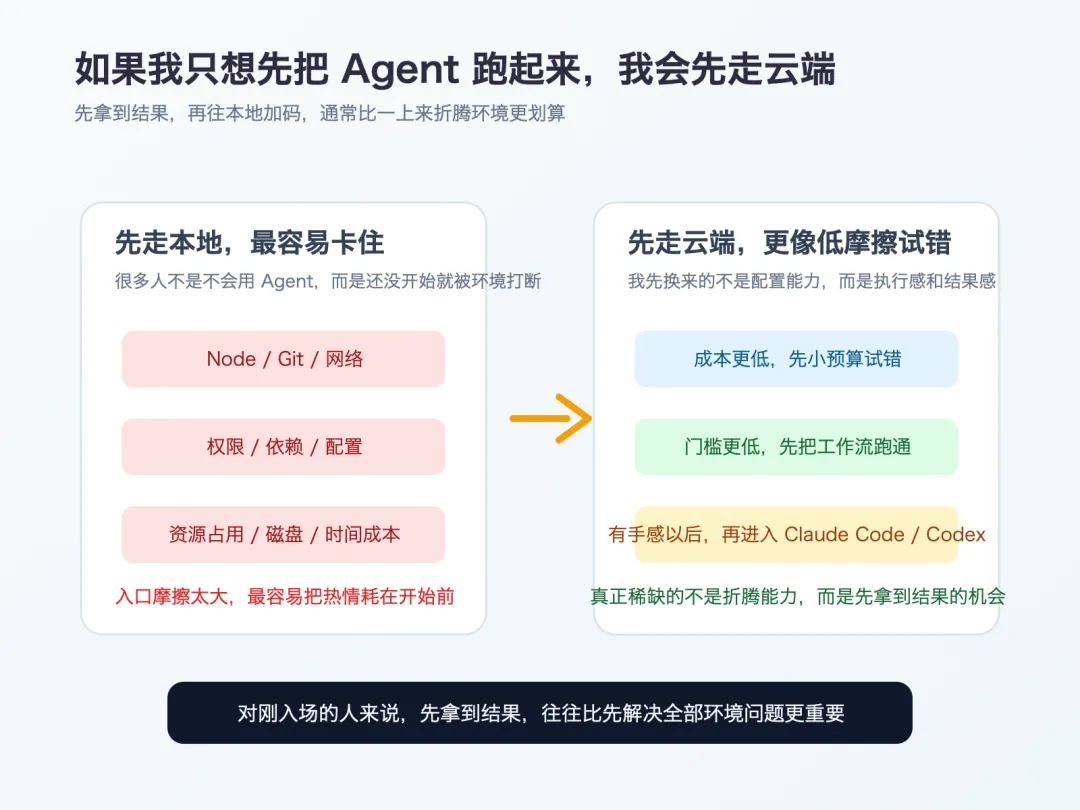 如果我只是想先把 Agent 跑起来,先体验这种执行感,先把一个真实任务做出来,我不会把自己的第一站放在重度本地折腾上。