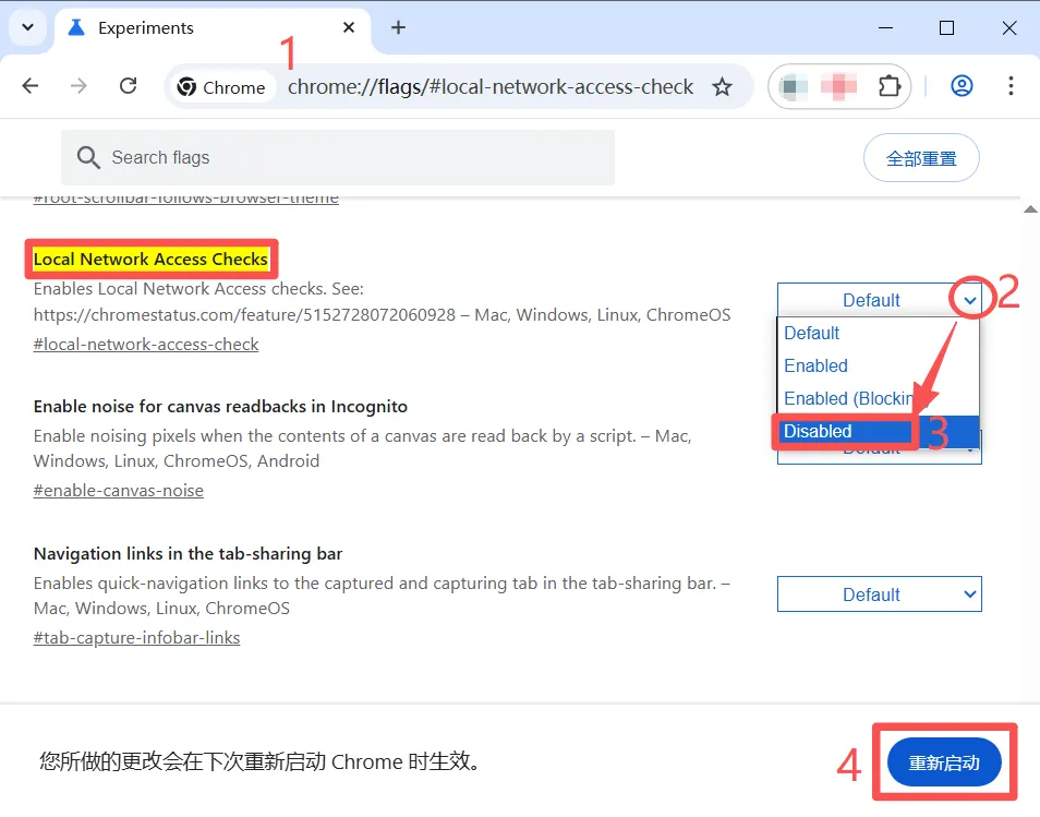二、Microsoft Edge 浏览器设置方法1. 在浏览器地址栏输入:edge://flags/#local-network-access-check并按回车键。2. 找到 Local Network Access Checks 设置项。3. 将该项的选项从 Default 或 Enabled 修改为 Disabled。4. 点击浏览器底部弹出的“重启”按钮或手动重启浏览器。5. 参考设置页面: